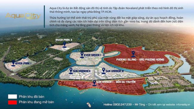 Aqua City là khu đô thị sinh thái thông minh có quy mô lớn nhất khu vực phía Nam, với diện tích gần 1.000 ha, lớn hơn cả khu đô thị Phú Mỹ Hưng (750 ha). Dự án gồm nhiều phân khu đa dạng, phát triển theo các giai đoạn khác nhau để đáp ứng nhu cầu cư dân và nhà đầu tư. Mỗi phân khu đều có thiết kế riêng biệt, tích hợp các tiện ích hiện đại, góp phần tạo nên một cộng đồng sống xanh, thông minh và tiện nghi trong khu đô thị lớn nhất phía Nam.